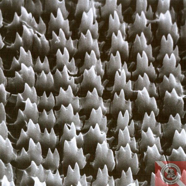 Язык улитки снабжен радулой — своеобразной теркой, покрытой многочисленными хитиновыми зубчиками. При помощи радулы улитка соскребает пищу, которую затем проглатывает. "Хитиновый язык" способен справиться с весьма твердыми продуктами. Радула постоянно обновляется, стершиеся "зубы" заменяются на новые. Увеличение 4000х